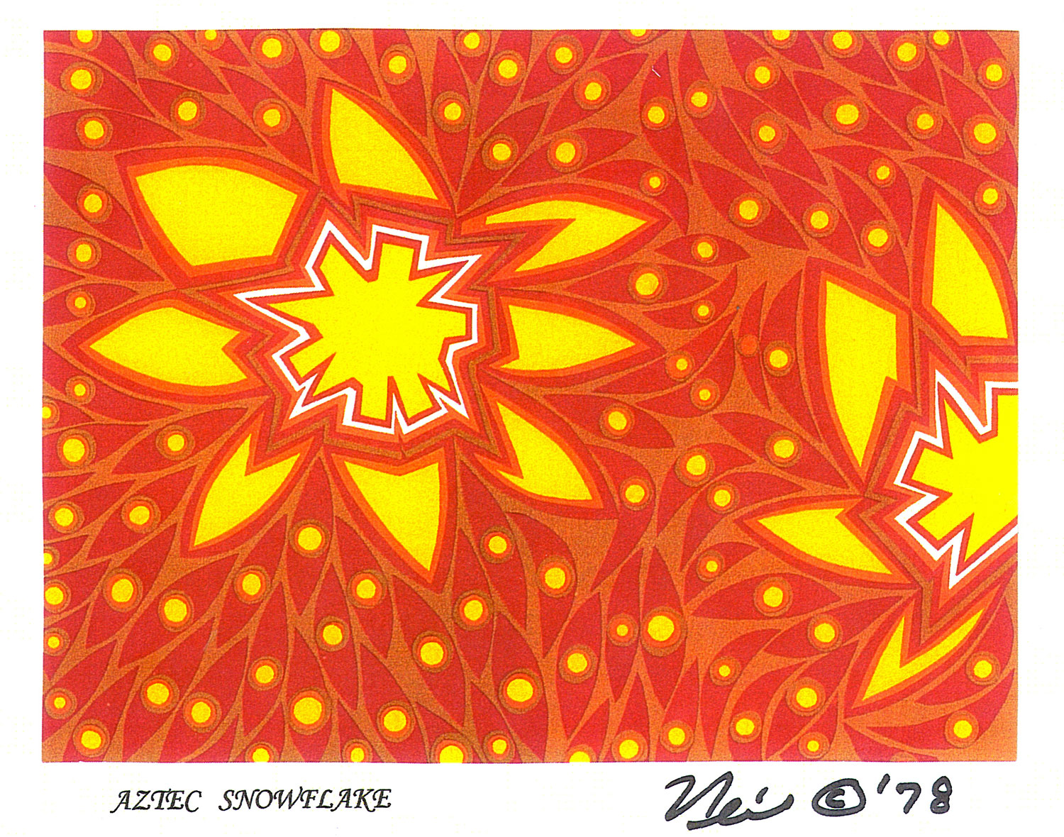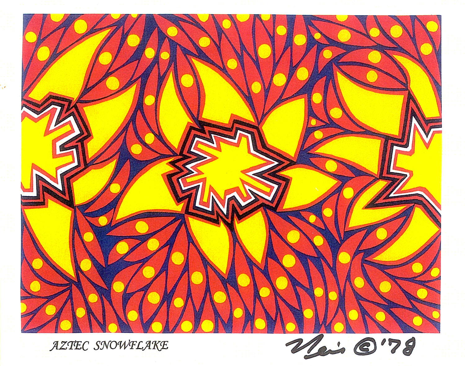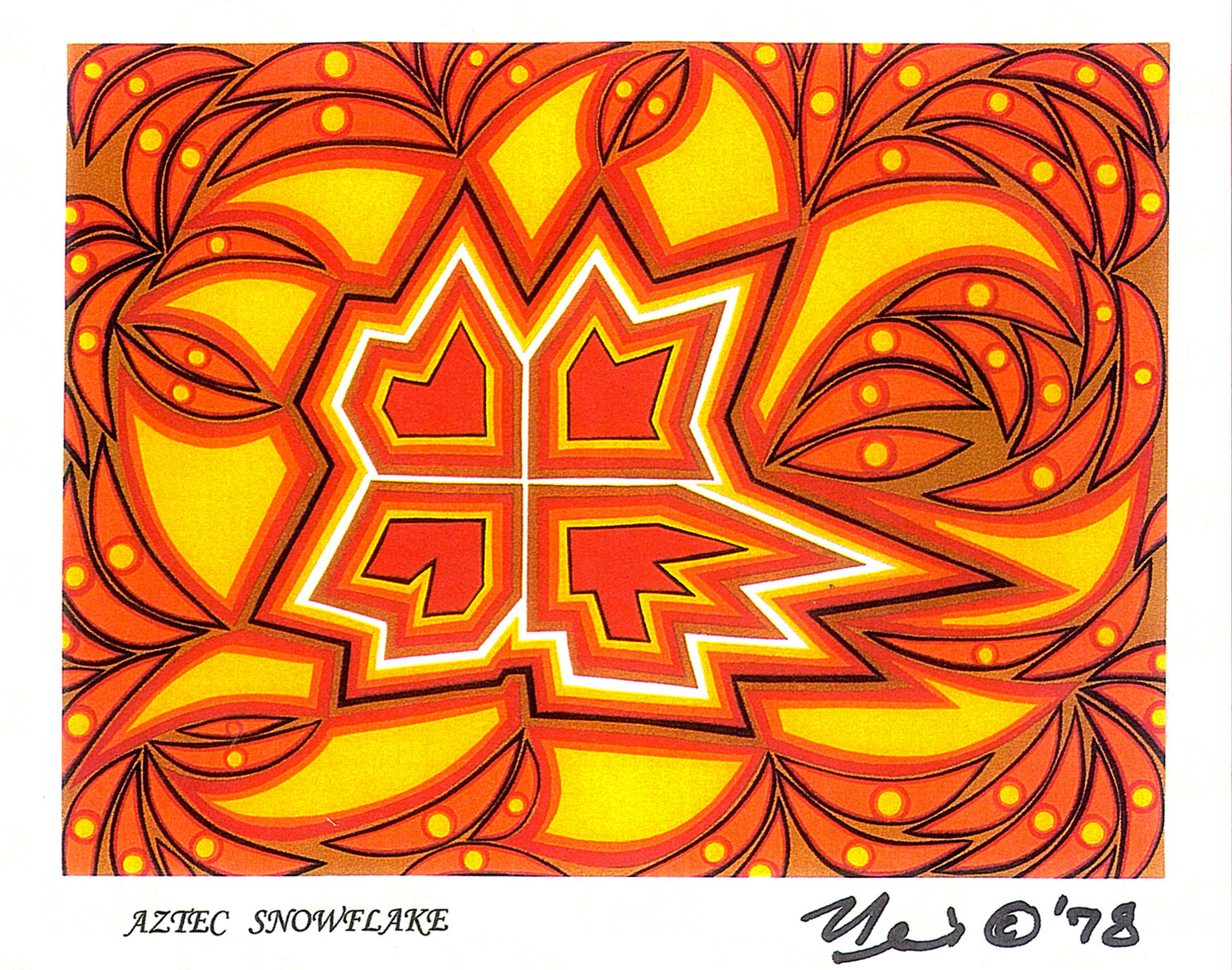 However, the artwork is not geometrically and symmetrical balanced like “Aztec” art, but like a snowflake, none are alike! Thus the “Aztec Snowflake” title.